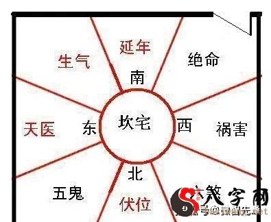 八宅派基础理论觉得,门要开益寿延年、发火、天医等吉位,好还需要朝着吉方。如下图坎宅,门能开在南方益寿延年、东南方发火吉位。不可以开在西北绝命、西方伤害、东北五鬼、大西北六煞四凶位。
